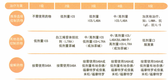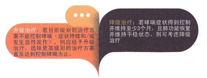 升级治疗:若目前级别的治疗方案不能控制哮喘(症状持续和/或发生急性发作),则应给予升级治疗,选择更高级别的治疗方案直至达到控制哮喘为止。