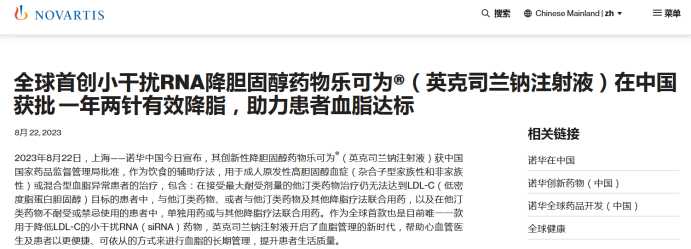 10月14日,全球首款也是目前唯一一款用于降低低密度脂蛋白胆固醇(LDL-C)的小干扰RNA(siRNA)药物英克司兰钠注射液在北京开出首批处方,一年两针(在初始治疗后三个月注射加强针,此后每年需注射两针),为心血管医生及患者提供更便捷、可依从的长期血脂管理方式。