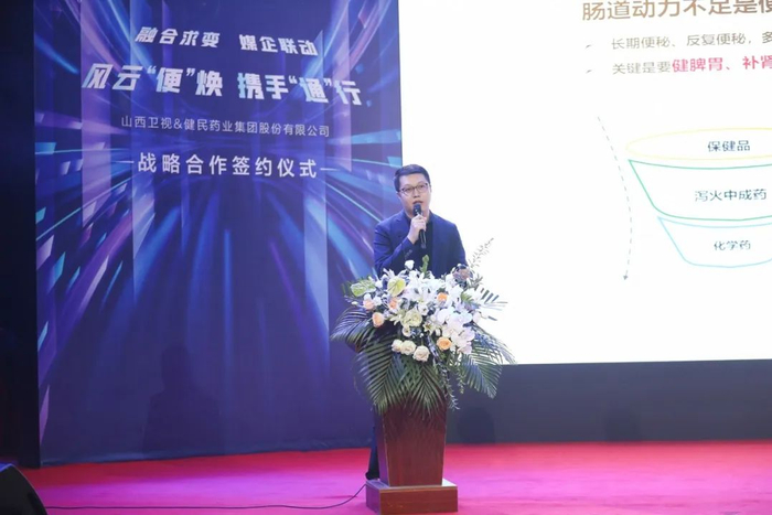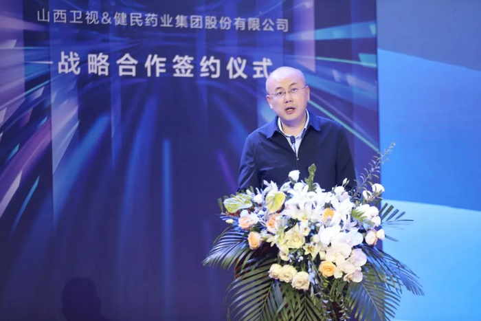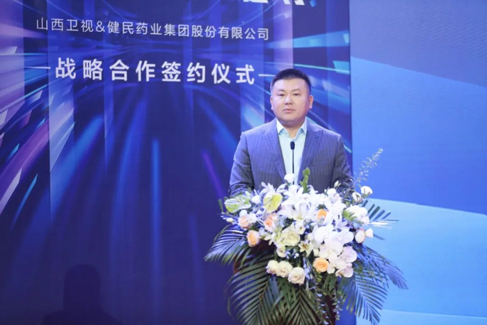 卫视节目中心商业服务部主任 张洪泰向大家介绍双方战略合作的具体情况。山西广播电视台已进行全面商业运营转型,致力于与健民集团展开深度合作。他们将共同建立大健康生态圈,以品牌共建为基础,为百姓提供高质量的产品和服务。