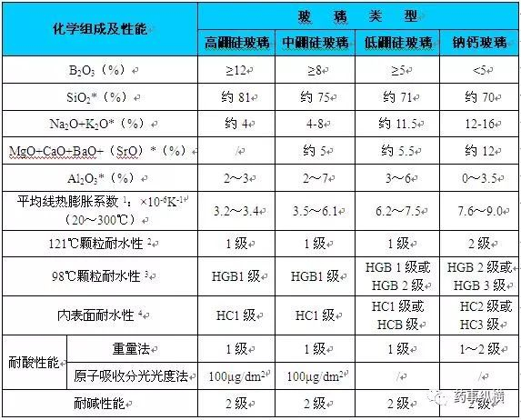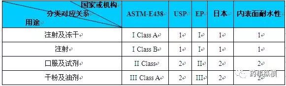 目前用于包装注射液的玻璃按照包装形式分类主要有输液瓶、安瓿、西林瓶、笔式注射器玻璃套筒、卡式瓶等。按照容器的制备工艺分类又可分为管制玻璃容器和模制玻璃容器。管制玻璃容器多适用于包装小容量注射液以及粉末,如安瓿瓶、笔式注射器玻璃套筒和预灌封注射器等;模制玻璃容器多适用于大容量注射剂、小容量注射液和粉末(模制注射剂瓶)的包装,如钠钙玻璃输液瓶、中硼硅玻璃输液瓶等。而按照玻璃材质或者耐水性能进行分类,国内按照表1进行分类;国外按照表2进行分类。