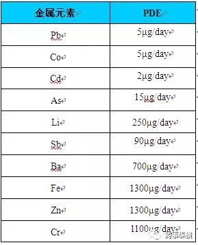 玻璃包装容器中组分多为无机盐。迁移入注射剂药液的常见元素包括Si、Na、K、Li、Al、Ba、Ca、Mg、B、Fe、Zn、Mn、Cd、Ti、Co、Cr、Pb、As、Sb等。应结合特定玻璃容器的组分以及添加物质的信息,对所含有的离子进行定量检查并进行安全性评估,主要参考ICH3Q的元素杂质的相关规定,如表5。