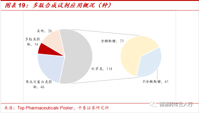 ②市场规模:据肽研社数据,预计2023年全球多肽合成试剂市场规模约68.5亿元,同比增长6.9%,国内多肽合成试剂市场规模约22.2亿元,同比增长9.9%,均处稳健增长态势。我们预计随着中下游需求持续提升,上游多肽合成试剂有望迎来快速增长期。