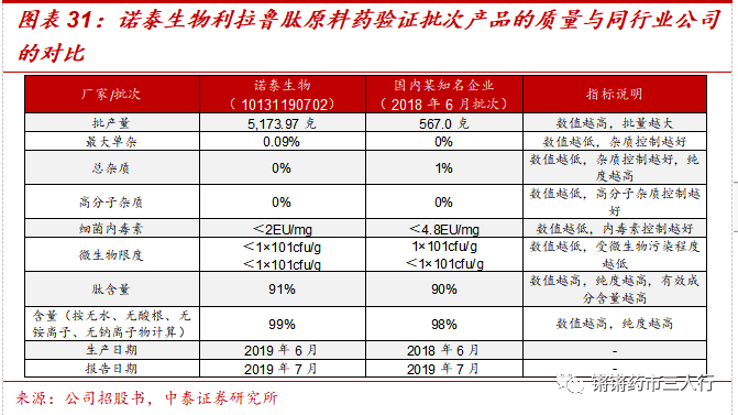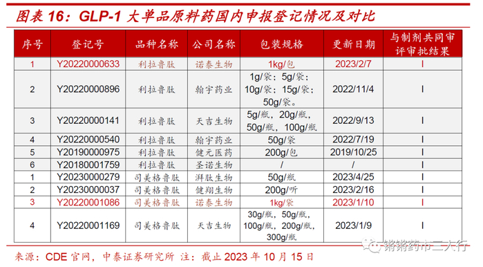③行业格局:根据CDE官网数据,截止2023年10月15日,国内利拉鲁肽及司美格鲁肽原料药申报登记仅8家,且包装规格上看,诺泰生物申报规格较大,具备一定的规模优势。