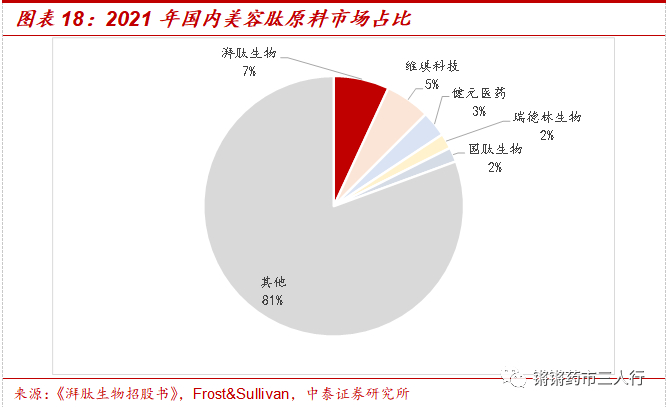②行业格局:根据弗若斯特沙利文数据,2021年国内美容肽原料市场以出厂价口径计算,排名前五的公司分别是湃肽生物、维琪科技、健元医药、瑞德林生物及国肽生物,分别占据6.9%、5.6%、3.2%、1.9%和1.8%的市场份额,CR5约19.3%,市场竞争格局较为分散。
