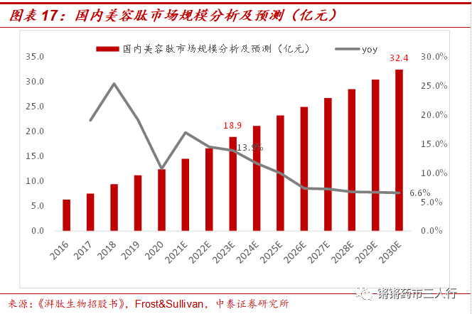 ①市场规模:在监管体系逐渐完善、居民护肤意识和需求不断增强等因素的影响下,我国美容肽原料行业正处于快速发展的阶段,市场空间广阔。全球方面,根据弗若斯特沙利文,全球美容肽原料市场规模在2016-2021年间保持16.8%的年复合增速。预计全球美容肽原料市场规模到2025年达到14.5亿美元,到2030年达到19.7亿美元。国内方面,伴随全球市场的发展,国内美容肽原料市场规模以18.2%的年复合增速从2016年的6.3亿增长到2021年的14.5亿。预计国内美容肽原料市场在2021-2025年及2025-2030年将以12.5%和6.9%的年复合增速快速增长,到2025年达到23.2亿,到2030年达到32.4亿。