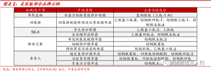 ■美容肽(多肽化妆品):美容肽原料因其安全、易吸收和高活性的特性,在解决皮肤褶皱、暗沉和衰老等方面效果显著。添加了多肽成分的护肤品,能够修复皮肤屏障功能、抗菌消炎、提亮水润、肌肤饱满弹润、紧致抗皱等功效,且增强和维持效果较高。近年来,美容肽原料已在众多品牌产品得到广泛应用,消费者关注度和认知程度都在不断提升。在各大厂商逐步发力、多肽化妆品原料品种不断拓展、功效日益显著的叠加作用下,多肽化妆品原料市场发展迅猛。根据国家药 监局发布的《已使用化妆品原料目录(2021年版)》,目前已经有70余种肽类原料收录其中。国内外知名品牌均推出以肽类物质为主要活性成分的护肤品。