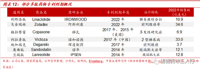 ①多个重磅多肽药物专利逐步到期,下游多肽仿制药市场迎来重要机遇。近年来随着利那洛肽、戈舍瑞林、兰瑞肽、奥曲肽等多个重磅多肽药物的专利保护期陆续到期,为多肽仿制药企及CMO公司迎来了较大的发展机遇。未来随着利那洛肽、戈舍瑞林等品种到期,多肽仿制药行业红利期有望持续。