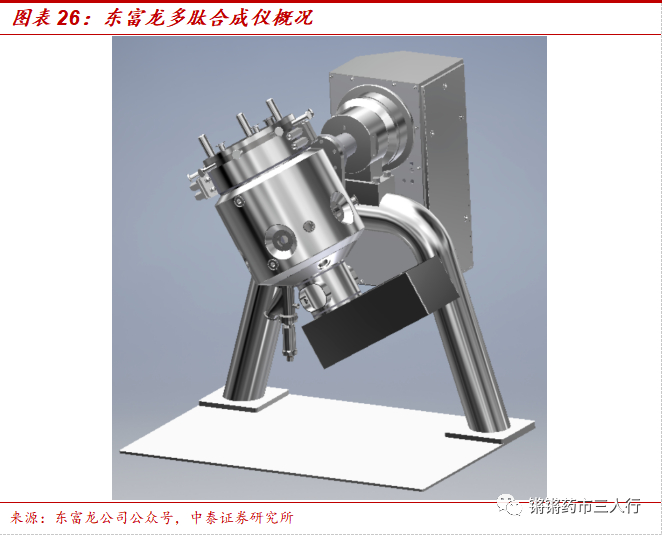 ③多肽合成仪:多肽合成仪即是用来合成多肽的仪器。多肽固相合成技术的发明同时促进了肽合成的自动化。世界上第一台真正意义上的多肽合成仪出现在1960年代末至1970年代初期,它是利用氮气鼓泡来对反应物进行搅拌,用计算机程序控制来实现有限度的自动合成。即为后来总结归纳出的第一代多肽合成仪。一般情况下,多肽合成仪整体由主体、传输设备、动力装置以及软件系统组成。多肽合成仪以固相合成为反应原理,在密闭的防爆玻璃反应器中使氨基酸按照已知顺序(序列,一般从C端-羧基端向N端-氨基端)不断添加、反应、合成,操作最终得到多肽载体。多肽合成仪历史可分为三个阶段:第一代多肽合成仪产生时间为上世纪六十年代末至七十年代初,代表产品是Beckman公司推出的Beckman990PeptideSynthesizer和Vega’sBiotechnologies公司推出的Vega’s296PeptideSynthesizer。第二代多肽合成仪诞生在上世纪八十年代,代表产品是ProteinTechnologies公司推出的PS3PeptideSynthesizer以及AdvancedChemTech公司推出的ACTpeptidesynthesizerModel90。第三代多肽合成仪诞生在上世纪九十年代,代表产品是美国AppliedBiosystems公司的ABI433peptidesynthesizer与CSBio公司的CS336无死角多肽合成仪。科研单位选择多肽合成仪主要考虑采购的设备需要具有其国际专利许可,规格一般以小型设备为主;生产型企业选型需考虑其连贯完整的设备生产线,从小型合成规模至生产型合成规模的各种设备齐全。通常大型设备可根据反应器大小判断其合成规模,通常可在线切割的玻璃材质反应器/反应釜需达100L,可保证批量产数十公斤的多肽产品。目前国内多肽合成仪大部分可实现自主可控,其中东富龙、派特生物等公司均可提供自主品牌的多肽合成仪。
