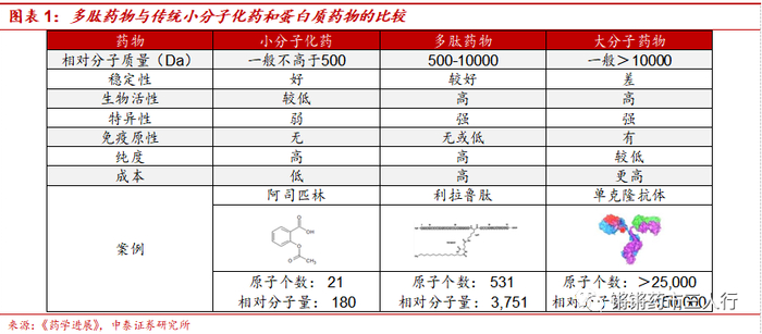 ■ 多肽药物:应用广泛,具有稳定性强、选择性高、副作用低等优势。肽是由多个氨基酸通过脱水缩合形成肽键连接而成的一类化合物,一般氨基酸数目小于10个称为寡肽,10~50个间称为多肽,50个以上称为蛋白质。多肽广泛参与并调节人体各项功能活动,如甲状腺素、胰岛素、生长因子等均属多肽类物质。多肽药物分子量介于生物药与化药之间,主要来源于内源性多肽或其他天然多肽,广泛作用于各项循环系统治疗相应疾病。