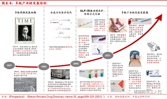 ■ 多肽合成技术的迭代,给药方式突破及适应症拓展推动了行业的发展: