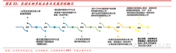 ■圣诺生物成立于2001年。公司成立之初主要为国内多肽制药企业和研发机构提供多肽类药物小试、中试、工艺研发、定制多肽生产等CDMO服务,在此过程中建立起包括GMP级原料药和制剂生产线在内的全流程研发管线和全产业链平台,在国内多肽药物领域积累了较高的知名度。公司先后为多家新药研发企业和科研机构提供了40余个项目的药学研究服务,其中1个品种获批上市进入商业化阶段,18个多肽创新药进入临床试验阶段。公司在药物研发生产过程中不断积累经验,自主选择在国内外具有较大市场空间和发展前景的多肽仿制药进行研发,成为国内最具实力的多肽研发生产企业之一。