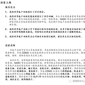 ■投资建议:中上游有望率先受益,持续看好。持续看好中游多肽原料药/中间体头部公司诺泰生物、圣诺生物、翰宇药业、金凯生科、海翔药业、美诺华等;原料药仿制药一体化布局的奥翔药业、奥锐特等;多肽CDMO头部公司药明康德、凯莱英等;国内美容肽原料龙头企业湃肽生物;上游多肽合成试剂龙头昊帆生物、多肽固相载体龙头蓝晓科技等。同时看好下游GLP-1R激动剂进展较快的信达生物、恒瑞医药、华东医药、通化东宝、联邦制药等。