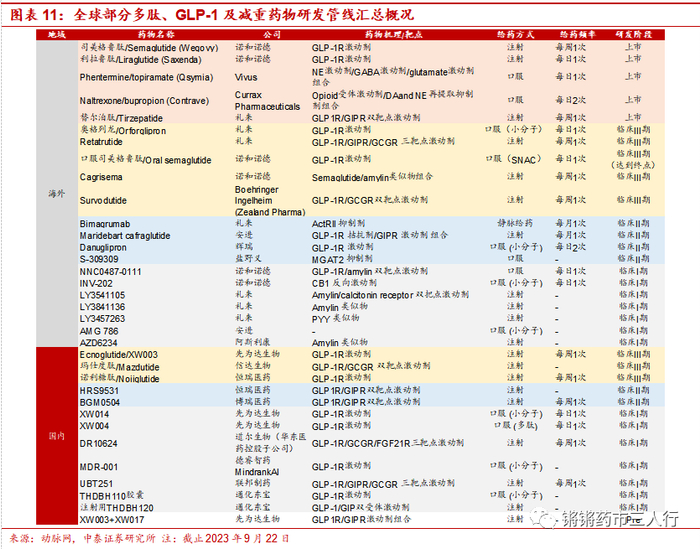 ③重磅减重项目方面,据动脉网数据,截止2023年9月22日,全球有72条减重肥胖药物管线正在进行,其中在GLP-1相关类似机制中,双靶点、多靶点组合及给药方式逐步成为增强疗效的主要创新路径。a.信达生物:2023年5月11日,信达生物披露了玛仕度肽(IBI362)作为国内首款双靶点减重药的II期研究数据,结果表明高剂量9毫克的玛仕度肽在治疗24周后取得了显著的减重效果,减重幅度达到了15%。b.先为达:2023年6月23日,杭州先为达公布Ecnoglutide(XW003)三项临床研究的积极结果:Ecnoglutide在成年肥胖患者中的临床II期研究、Ecnoglutide用于成年2型糖尿病患者血糖控制的II期临床研究,以及Ecnoglutide用于成年超重/肥胖患者体重管理的临床Ic期研究,其中临床I期和II期研究数据将显示Ecnoglutide在治疗超重/肥胖症和2型糖尿病临床研究中的安全性和有效性;c.勃林格殷格翰:2023年6月23日,勃林格殷格翰(BI)和Zealand Pharma A/S公布 survodutide(BI 456906)II期临床数据,数据显示在治疗46周后,survodutide对超重或肥胖但没有2型糖尿病的患者具有优于安慰剂的疗效,有40%使用达2剂survodutide最高剂量的患者,其体重减轻约20%。我们预计随着项目持续推进,国内多肽药物外包服务市场有望不断受益。