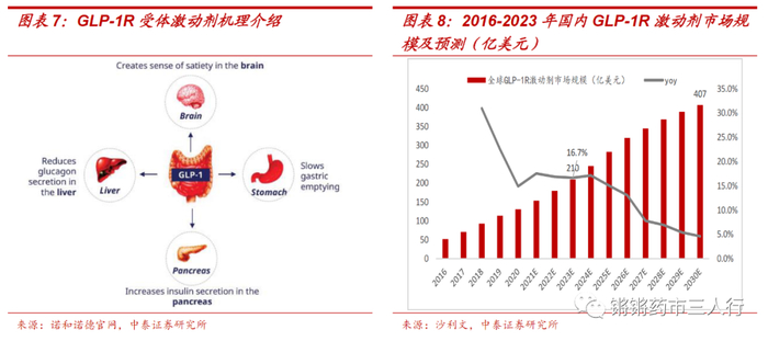②GLP-1R减重需求有望带来多肽药物新一轮提速增长:A.GLP-1:是一种天然存在于人体的肠促胰岛素,通过激动广泛分布的GLP-1受体发挥减肥作用,但极易降解;B.GLP-1R激动剂安全有效,已成为减肥药物临床研究的核心靶点。多款GLP-1R激动剂成功上市,其主要适应症为成人2型糖尿病。目前有诺和诺德的利拉鲁肽、司美格鲁肽及礼来的替尔泊肽获批减肥适应症;C.GLP-1R激动剂类药物凭借优异的减重效果,良好的安全性和心血管受益,未来有望成为减重市场的核心品类,同时在国内其临床进展较快,司美及利拉国内减重适应症处上市申报中;D.减重患者基数庞大,据Insight 数据显示,2019年国内成人的超重和肥胖率分别为34.3%和16.4%,且世界肥胖联盟预测国内2035年约18%成人BMI≥30kg/m2,年增速高达5.4%,患者基数庞大;E.全球GLP-1R激动剂市场规模:据沙利文数据,预计2023年全球GLP-1R激动剂市场规模约210亿美元,2020-2023E约17.0%;F.重磅GLP-1R激动剂处快速放量期:据诺和诺德财报数据,2022年全球利拉鲁肽减重产品Saxenda及司美格鲁肽减重产品Wegovy合计销售约24.3亿美元(同比+101%,其中Saxenda约15.4亿美元,Wegovy约8.9亿美元,以美元:丹麦克朗约6.93计算),此外,据医药魔方数据,2022年礼来替尔泊肽上市9个月销售约4.83亿美元。G.司美个露台新适应症拓展:2023年8月8日,诺和诺德发布司美格鲁肽心血管结局试验SELECT的主要结果,试验实现了主要目标,具有里程碑意义。此外,2023年10月,诺德诺德公布司美格鲁肽慢性肾病疗效优异,提前终止III期临床。