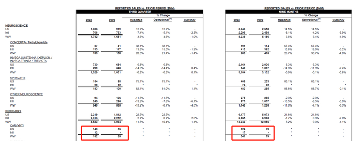 其中创新药物销售139亿美元,同比增长8.9%。而强生与传奇生物合作的BCMA CAR-T疗法Carvykti在Q3销售1.52亿美元(约11.11亿人民币,按最新汇率1 美元 ≈ 7.3117 人民币计算);2023年前三季度,Carvykti累计销售达到3.41亿美元(约24.93亿人民币),按照50%的分成,传奇生物可获得1.7亿美元收入(约12.47亿人民币)。