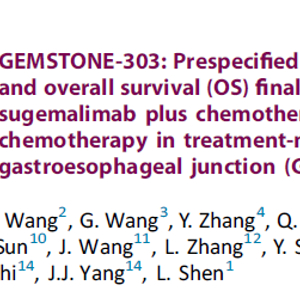 GEMSTONE-303是一项多中心、随机、安慰剂对照的3期注册性临床试验,旨在评估舒格利单抗联合CAPOX化疗方案作为一线治疗无法手术切除的PD-L1表达≥5%的局部晚期或转移性胃腺癌或胃食管结合部(G/GEJ)腺癌的疗效和安全性。早先,中国国家药监局(NMPA)已经受理舒格利单抗针对该项适应症的上市申请。