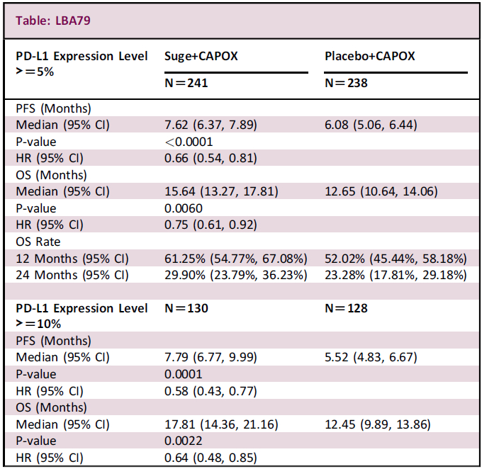 该研究结果表明,舒格利单抗联合CAPOX在PFS和OS方面具有统计学意义和临床意义的改善,具有可管理的安全性。这些发现支持舒格利单抗+CAPOX作为PD-L1表达≥5%的晚期G/GEJ腺癌患者的新的一线治疗选择。