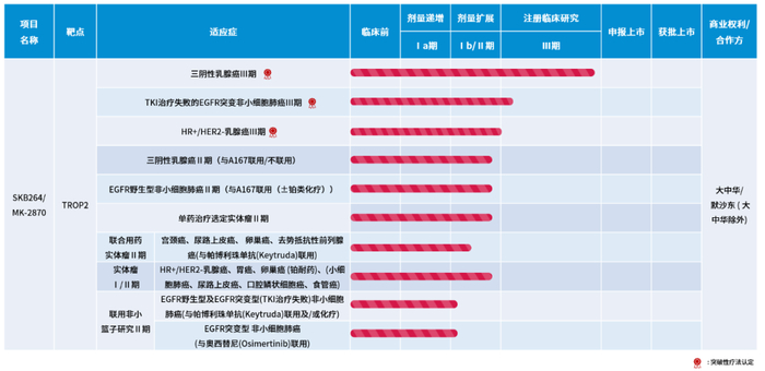 在国内,SKB264单药治疗至少经二线治疗失败的晚期或转移性TNBC患者的Ⅲ期注册临床研究进展顺利,有望成为首个获批上市的国产TROP2-ADC 。SKB264单药用于TKI耐药EGFR突变非小细胞肺癌患者Ⅲ期临床研究正快速推进中。多项联合K药(抗PD-1单抗)或KL-A167(抗PD-L1单抗)Ⅱ期临床研究正在开展。