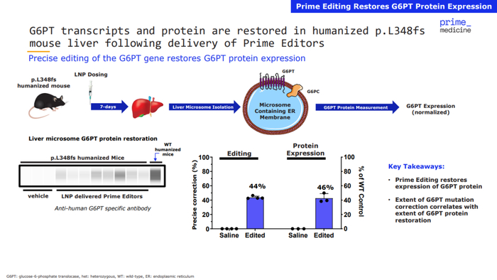 GSD1b是一种罕见、严重的进行性疾病,由于编码葡萄糖-6-磷酸转运蛋白(G6PT)的基因SLC37A4突变所致,会导致糖原代谢受损。已知P.L348fs和P.G339C突变是该疾病最普遍的致病突变,在约46-52%的GSD1b患者群体中发现。根据科学文献和Prime Medicine研究,纠正不到10%肝细胞中的SLC37A4基因突变可能足以逆转这种疾病的许多表现。