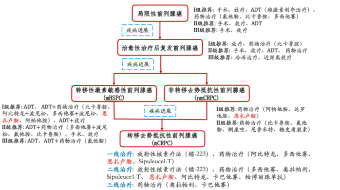 前列腺癌属于多阶段进行性疾病,其多个演变阶段具有不同的分子特征、药物反应和耐药机制,因此需在不同的演变阶段更换不同的治疗方案。