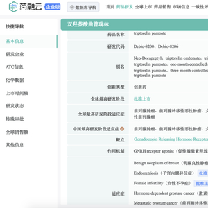 药融云数据,www.pharnexcloud.com显示:注射用双羟萘酸曲普瑞林15mg(达菲林®三月剂型)是由益普生公司研发的长效促性腺激素释放激素类似物(Gonadotropin-releasing hormone agonist,GnRHa),于2023年3月7日获得中国国家药品监督管理局(NMPA)正式批准用于中枢性性早熟(Central precocious puberty,CPP)的治疗,受理号JXHS2200066。