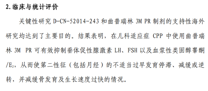 本次基于双羟萘酸曲普瑞林中国临床研究结果( D-CN-52014-243)、国外关键研究( 2-54-52014-143) 及随访研究( 2-54-52014-159),支持双羟萘酸曲普瑞林在中国新增适应症申请。