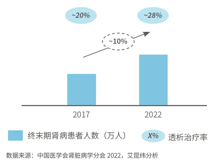 2020年全球ESRD患者人数已突破1200万人,预计至2030年将达1450万。中国ESRD患者数量位居全球首位,占比接近30%,折合现有患者人数达350万。中国每年新增ESRD患者10-20万人,预计至2032年患者规模将增至480万人。ESRD患者增长主要来自于早中期CKD患者进展至疾病终末期,并且现有患者受益于医疗水平提高,平均生存时间增加。