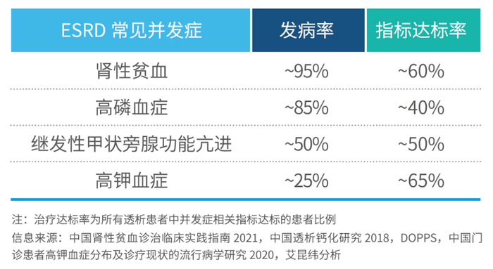 药物治疗是ESRD各类并发症的重要治疗手段之一。根据中国临床指南标准,整理透析患者并发症治疗相关指标达标率,结合各并发症患病率,汇总如下: