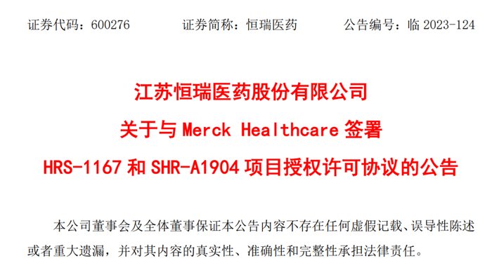 10月30日,恒瑞发布公告,与Merck Healthcare达成协议,将具有自主知识产权的1类新药HRS-1167片和注射用SHR-A1904项目有偿许可给Merck Healthcare。
