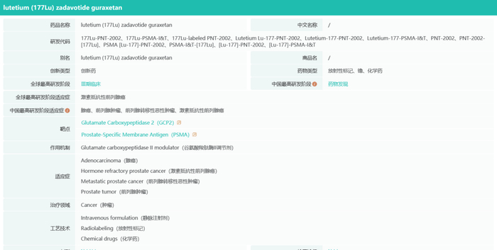 PNT2002是一种由Lu-177(镥-177)标记、靶向PSMA(前列腺特异性膜抗原)的小分子药物,被开发用于治疗mCRPC(转移性去势抵抗性前列腺癌)。PNT2002将PSMA靶向配体(PSMA-I&T)与发射β射线的放射性同位素,无载体添加Lu-177结合。药融圈旗下药融云数据www.pharnexcloud.com显示,PNT2002已获得FDA授予的快速通道资格,目前正处于3期试验中(SPLASH研究,NCT04647526),研究旨在评估PNT2002在雄激素受体通路靶向治疗后进展的mCRPC患者中的有效性与安全性。
