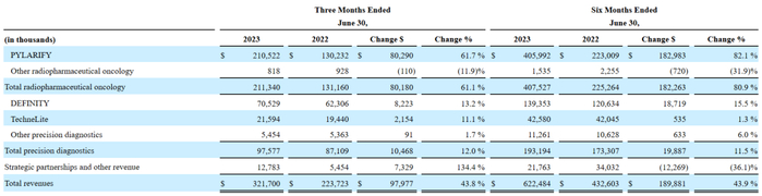 上半年肿瘤学放射性药物总收入为4.075亿美元(+80.9%),PYLARIFY(Piflufolastat F-18)产品业绩达4.06亿美元(82.1%);精准诊断产品总收入1.932亿美元(+11.5%),DEFINITY(八氟丙烷脂质微球混悬型注射剂)业绩为1.394亿美元(+15.5%),TechneLite业绩为4258万美元(+1.3%);战略合作产品及其他产品收入为2176万美元(-36.1%)。