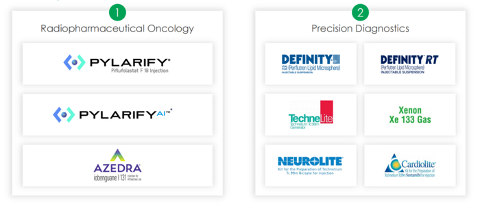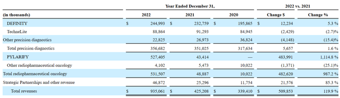 从产品收入来看,精准诊断产品总收入3.567亿美元(+1.6%),其中DEFINITY(八氟丙烷脂质微球混悬型注射剂)业绩达2.45亿美元(+5.3%),Tc -99m发生器TechneLite业绩为8886万美元(-2.7%);肿瘤学放射性药物总收入为5.315亿美元(+987.2%),该部分业务得益于PYLARIFY(Piflufolastat F-18)成功商业推出,该产品业绩高达5.274亿美元;战略合作产品及其他产品收入为4687万美元(+85.3%)。