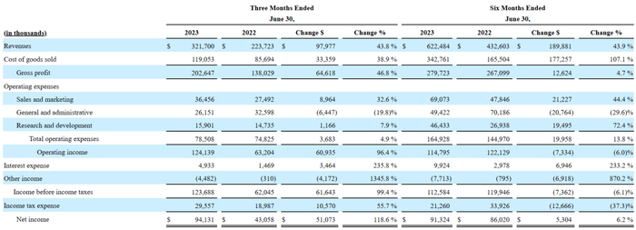 2023年上半年,Lantheus全球总收入6.225亿美元,同比增长43.9%;根据一般公认会计原则,公司上半年净收入为9132万美元,同比增长6.2%。上半年运营开支1.649亿美元(+13.8%),其中销售和市场营销费用6907万美元(+44.4%);一般和行政开支4942万美元(-29.6%);研究与开发费用为4643万美元(+72.4%)。
