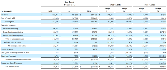 2022年Lantheus公司全球总收入9.351亿美元,同比增长119.9%;根据一般公认会计原则,2022全年净收入为2807万美元,同比增长429.1%。全年运营开支5.455亿美元(+106.8%),其中销售和市场营销费用1.002亿美元(+46.5%);一般和行政开支1.336亿美元(-11.2%);研究与开发费用为3.117亿美元(+593.1%)。