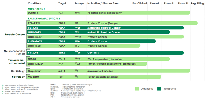 针对已上市产品,心血管超声造影剂DEFINITY(八氟丙烷脂质微球混悬型注射剂)正在被开发用于小儿超声心动图,目前处于3期临床研究;F18标记的靶向PSMA的PET显像剂PYLARIFY(PiflufolastatF-18、18F-DCFPyL或PyL)已在欧洲提交注册申请(由Curium公司负责)。