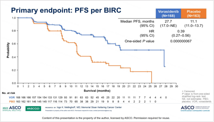Vorasidenib组中位PFS为27.7个月(95%CI:17.0-未达到),安慰剂组中位PFS为11.1个月(95%CI:11.0-13.7),降低疾病进展或死亡风险61%,HR=0.39(95%CI:0.27-0.56,单侧P=0.000000067)。