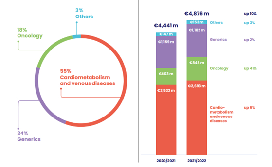 2021/2022年的综合销售收入总计48.76亿欧元。比上年增长9.8%。品牌药销售收入同比增长12.5%,2021年/2022年达到36.94亿欧元,而销售额仿制药收入同比增长2.0%,2021/2022年增至11.82亿欧元。