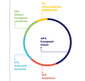 销售收入从地区分布来看,欧盟以外的销售收入比例同比增长15%,达到56%。该集团的美国子公司成为其最大的子公司,超过了中国,品牌药品的销售收入总计4.37亿欧元。施维雅扩展了整个美洲大陆的业务,销售收入增长了44.8%,达到2.71亿欧元。在全球11个国家,该集团的销售收入超过1亿欧元,总计29.64亿欧元,占合并销售收入的60.8%。2021/2022年的EBITDA为8.59亿欧元,增长34.6%,目前占集团销售收入的17.6%,而上一年为14.4%。这一业绩表明,法国以外地区产生的销售收入比例较高。
