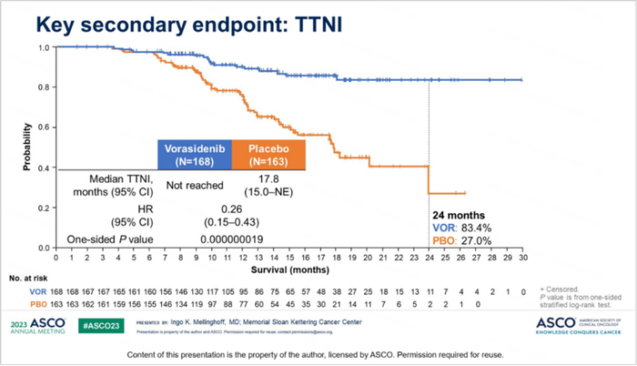 Vorasidenib组的中位TTNI未达到,安慰剂组TTNI为17.8个月(95%CI:15.0-未达到),HR=0.26(95%CI:0.15-0.43,单侧P= 0.000000019)。