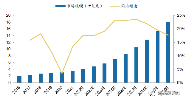 近年来,对干眼症发病机制的研究已不再局限于泪液分泌不足和泪液蒸发增加,而是涉及泪膜稳定性、泪液渗透压、神经感觉异常及眼表炎症等多方面,各家药企均有相应布局,市场竞争激励,多个新药及疗法尚处开拓阶段。中国干眼药市场近年来增长迅速,根据沙利文分析数据,中国干眼药物市场规模从2016年的19亿元增长到2020年的30亿元,复合年增长率为11.3%,预计2030年干眼药市场规模将达到180亿元。