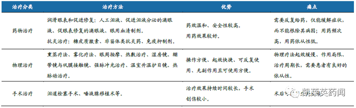 干眼症属于眼表疾病的一种,治疗难度较大,已逐渐成为眼科诊疗中非常重要的市场之一。干眼症的主要症状有眼部干涩感、异物感、灼烧感等,是由多种因素引起的慢性眼表疾病,医学界通常认为其主要病理机制是因泪液的质或量异常导致泪膜不稳定或眼表微环境失衡,伴眼表炎症反应、组织损伤及神经感觉异常。根据干眼的类型和程度进行长期和个体化治疗,目前主要分为药物、物理和手术治疗三种疗法。