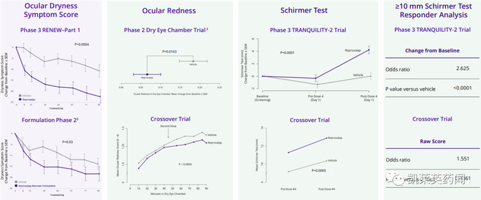 病患在接受一天的reproxalap(0.25%)治疗后,其在试验的两项主要终点,即在干燥眼房(dry eye chamber)中的眼睛发红情形(P=0.0004)与Schirmer测试(P=0.0005)上,都在统计学上显著优于载体对照组。