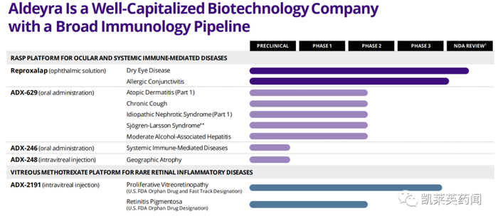 Aldeyra即将商业化的候选产品有reproxalap(一种治疗干眼病和过敏性结膜炎的潜在药物)和ADX-2191(一种治疗原发性玻璃体视网膜淋巴瘤、增殖性玻璃体视网膜病变和色素性视网膜炎的潜在药物)。此外,Aldeyra正在开发其他候选产品,包括ADX-629和化学相关分子,用于全身性和视网膜免疫介导疾病的潜在治疗。