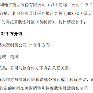 本次订单进一步巩固和提升了公司的国际市场竞争力,促进公司长远发展,与客户深度绑定。11月3日,翰宇药业在深交所互动易透露,公司GLP-1类多肽制剂:利拉鲁肽预填充注射笔制剂,于近日收到了来自该产品在美国的合作方合计1408.32万美元的首笔商业批《采购订单》,作为产品获批后第一笔订单。