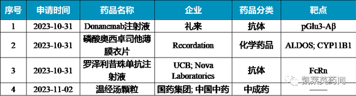 10月31日,UCB的罗泽利昔珠单抗注射液的NDA获CDE受理。罗泽利昔珠单抗(Rozanolixizumab)通过阻断FcRn 和免疫球蛋白 G (IgG) 的相互作用,加速抗体的分解代谢,从而降低总体IgG和病理性自身抗体水平。目前,该药物正开发治疗多种由致病性IgG自身抗体驱动的自身免疫性疾病,原发性免疫性血小板减少症、自身免疫性脑炎等。2023年6月,皮下注射Rozanolixizumab获美国FDA批准上市,用于治疗抗乙酰胆碱受体(AChR)或抗肌肉特异性酪氨酸激酶(MuSK)抗体阳性成人gMG。