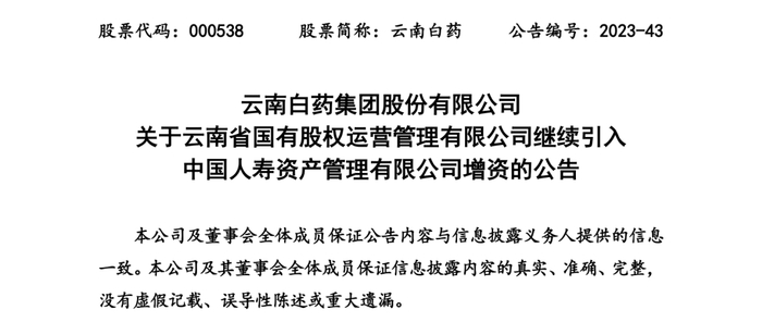 这是继去年5月获中国人寿90亿元增资后,市值900亿的云南白药并列第一大股东云南省国有股权运营管理有限公司再获中国人寿增资。