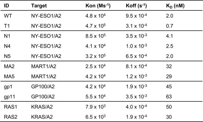 表S2 TCRm对同源多肽/HLA-A*02:01的SPR亲和力