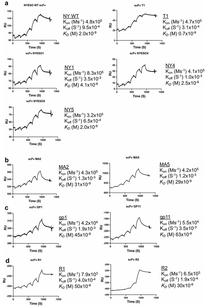 通过酵母表面展示技术对4种已建立的人类肿瘤抗原进行了筛选:NY-ESO1/HLA-A*02:01、MART1(A2L)/HLA-A*02:01、gp100(A9V)/HLA-A*02:01和KRAS/HLA-A*02:01 (图5 c-f)。用相同的抗体支架重新选择了NY-ESO1,但使用新文库分离NY-ESO1的新变体,而其他三个多肽代表新的HLA-A*02:01限制性特异性。经过四轮选择后,观察到针对每个靶标pMHC的结合剂的特异性富集。酵母展示的针对每个抗原的scFv克隆与用于选择的所有pMHC的pMHC tetramer染色以评估正交性。新的TCRm克隆(表S1)与其靶标的pMHC显示出高度特异的反应性,但与非靶标的pMHC的交叉反应可忽略不计,这表明反应性取决于多肽而不是HLA-A*02:01(图5 c-f右)。纯化的重组scFv的结合亲和力显示出从个位数到两位数的KD (图S5 a-d和表S2)。