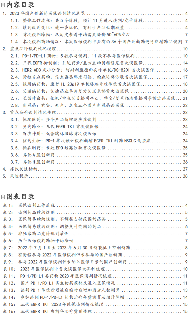 ■核心观点:医保谈判续约政策持续优化,创新药长期放量可期。2023 年医保谈判预计将于 11 月开启,多个国产创新药将参加本年度医保谈判。从政策层面来看,今年医保局进一步更新了去年发布的谈判药品续约规则,对续约规则做了进一步优化(例如新增纳入 4 年以上的品种降幅在原基础上减半、纳入 8 年的品种纳入常规目录等),有利于医保目录内创新药的长期持续放量;从参与谈判药品来看,本次医保谈判中多个药品进行首次谈判、新增适应症谈判、到期续约谈判等,国产创新药医保谈判已经进入常态化阶段。