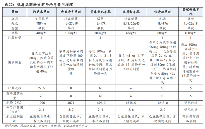 当前已上市银屑病生物制剂中,已在医保目录中的艾伯维等的阿达木单抗年治疗费用约3.1万元,杨森制药的古塞奇尤单抗年治疗费用约3.7万元、乌司奴单抗年治疗费用约2.6万元,诺华的司库奇尤单抗年治疗费用约2.4万元,礼来的依奇珠单抗年治疗费用约2.2万元。